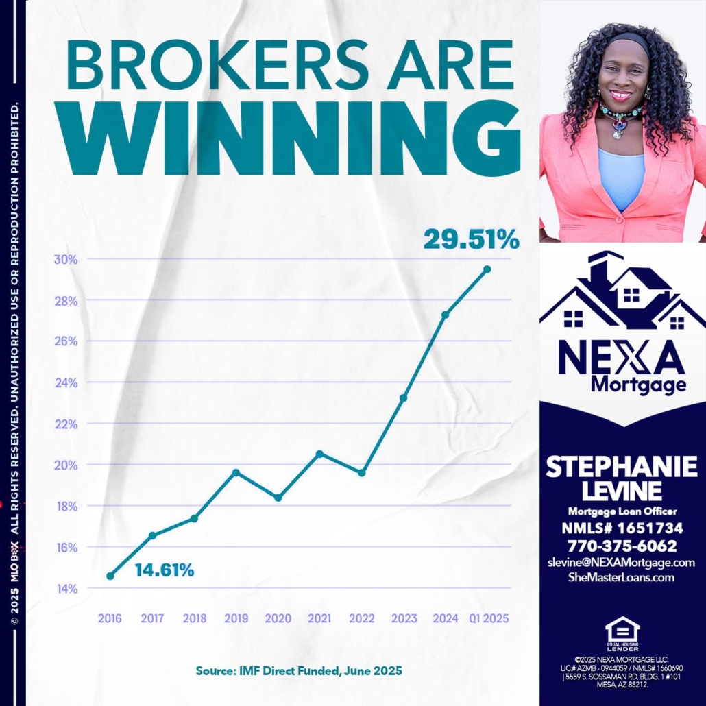 BROKERS ARE WINNING - Stephanie Levine -Mortgage Loan OfficerHi, my name is Stephanie Levine. I’m a Loan Officer with NEXA Mortgage LLC., offering personalized mortgage solutions, fast customized quotes, great rates and service with integrity.