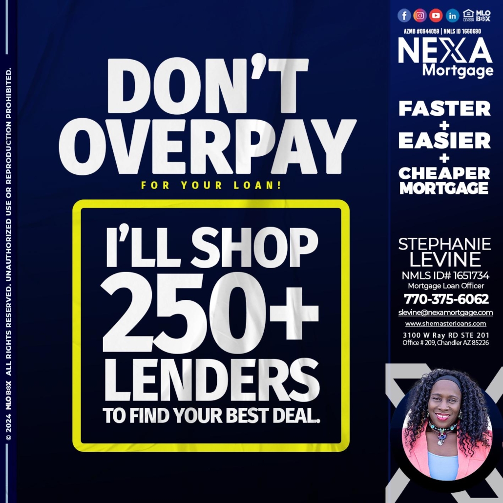 dont overpay - Stephanie Levine -Mortgage Loan OfficerHi, my name is Stephanie Levine. I’m a Loan Officer with NEXA Mortgage LLC., offering personalized mortgage solutions, fast customized quotes, great rates and service with integrity.