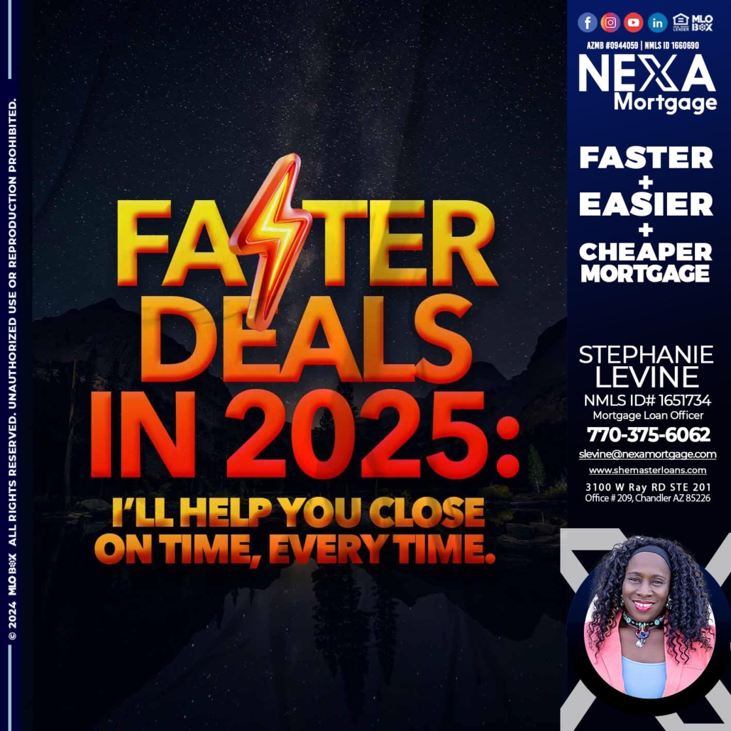 Hi, my name is Stephanie Levine. I’m a Loan Officer with NEXA Mortgage LLC., offering personalized mortgage solutions, fast customized quotes, great rates and service with integrity.