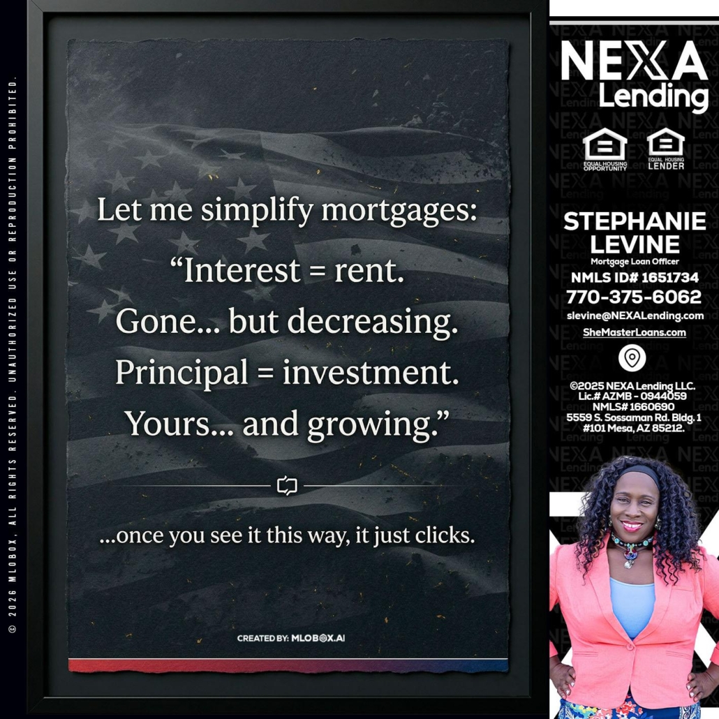 Hi, my name is Stephanie Levine. I’m a Loan Officer with NEXA Lending LLC., offering personalized mortgage solutions, fast customized quotes, great rates and service with integrity.
