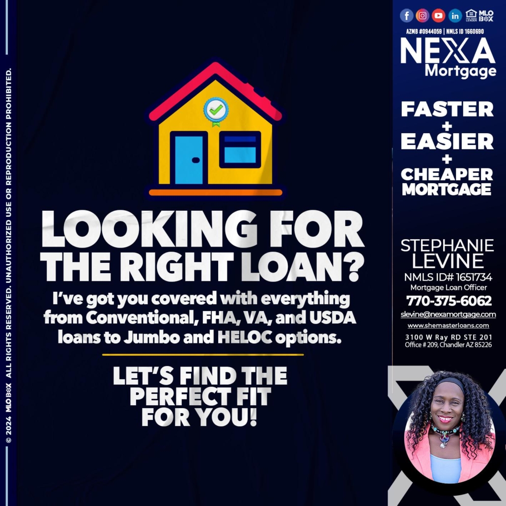 Hi, my name is Stephanie Levine. I’m a Loan Officer with NEXA Mortgage LLC., offering personalized mortgage solutions, fast customized quotes, great rates and service with integrity.