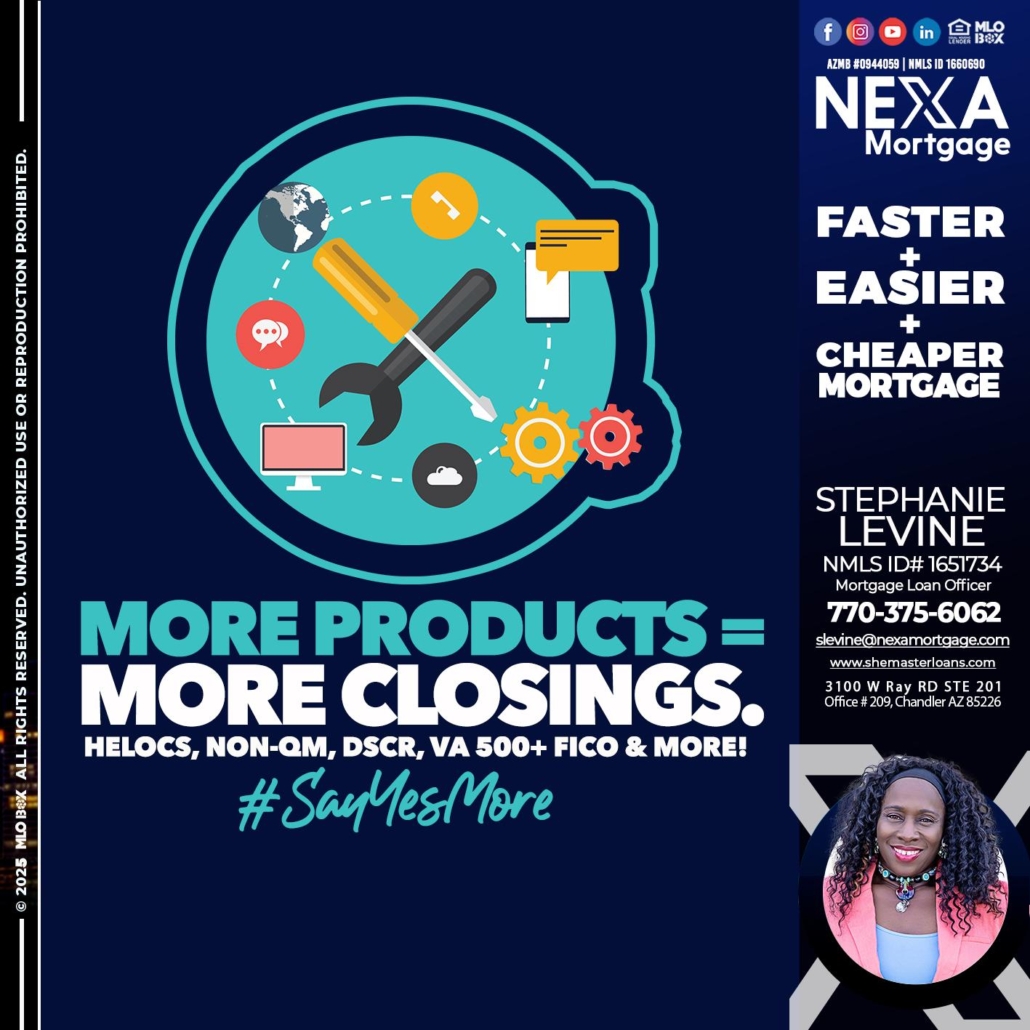 MORE PRODUCTS - Stephanie Levine -Mortgage Loan OfficerHi, my name is Stephanie Levine. I’m a Loan Officer with NEXA Mortgage LLC., offering personalized mortgage solutions, fast customized quotes, great rates and service with integrity.