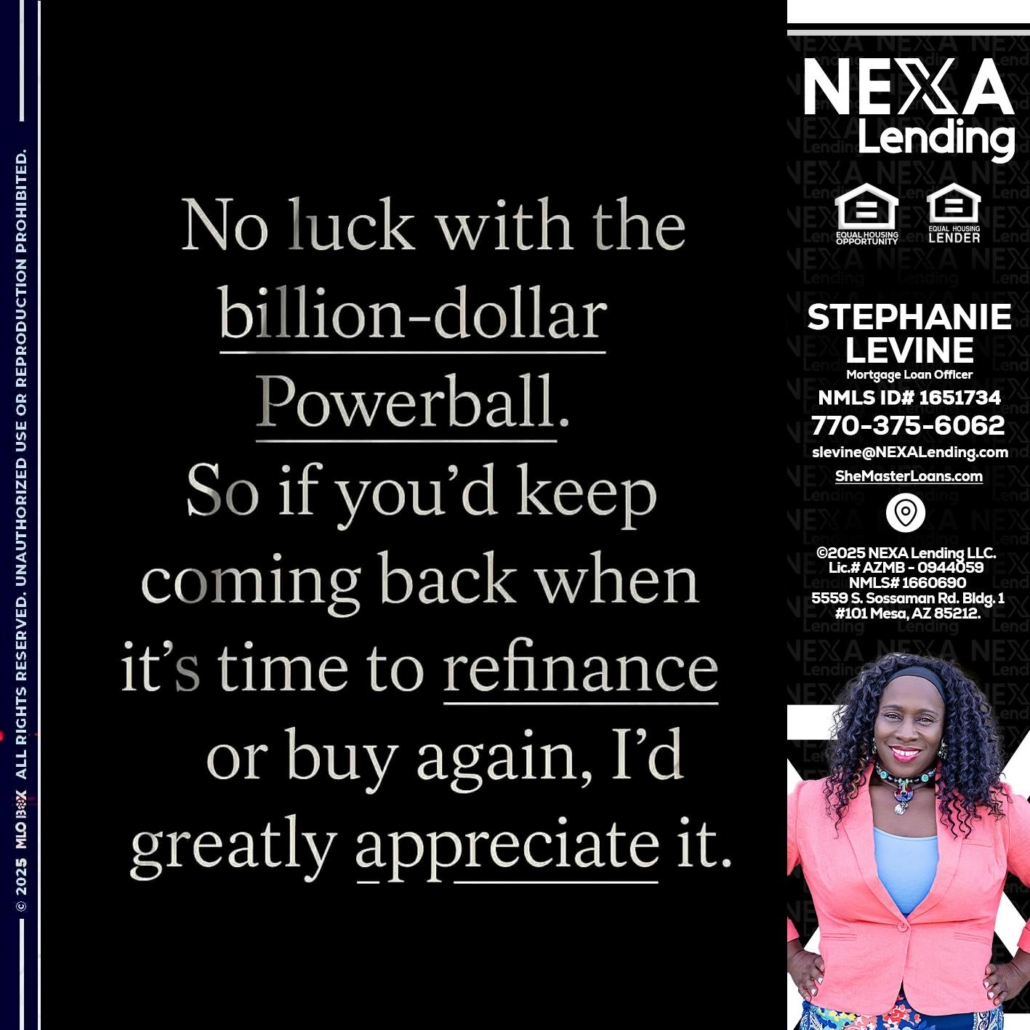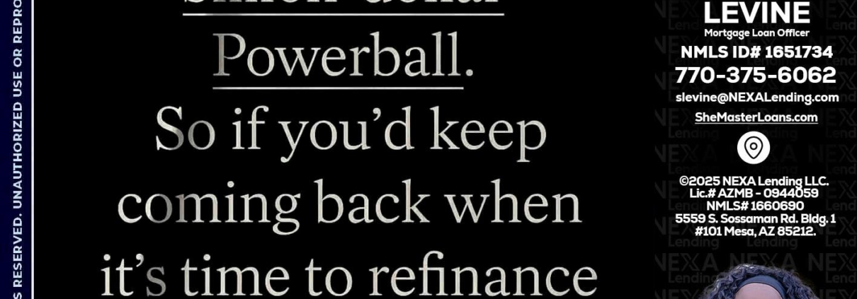 Hi, my name is Stephanie Levine. I’m a Loan Officer with NEXA Lending LLC., offering personalized mortgage solutions, fast customized quotes, great rates and service with integrity.