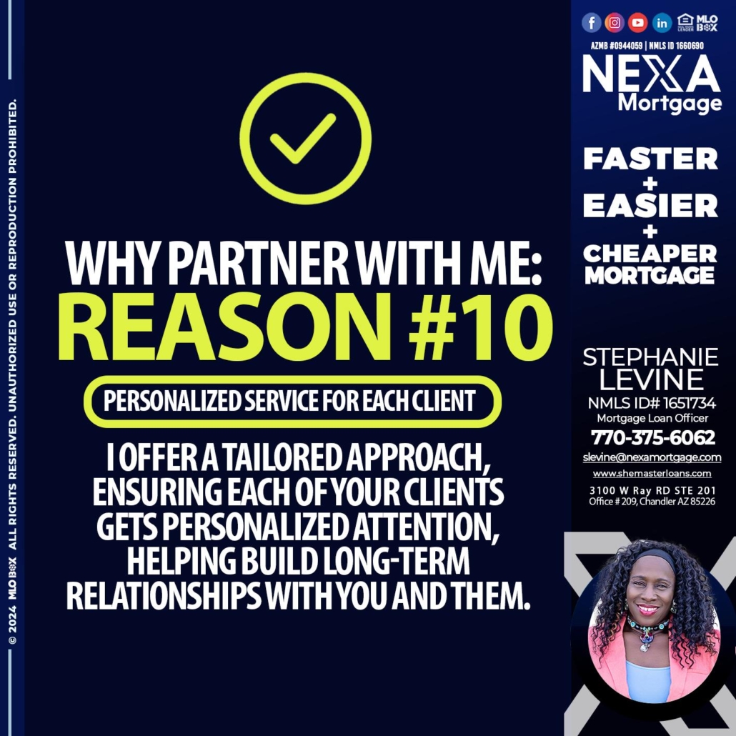 R10 - Stephanie Levine -Mortgage Loan OfficerHi, my name is Stephanie Levine. I’m a Loan Officer with NEXA Mortgage LLC., offering personalized mortgage solutions, fast customized quotes, great rates and service with integrity.