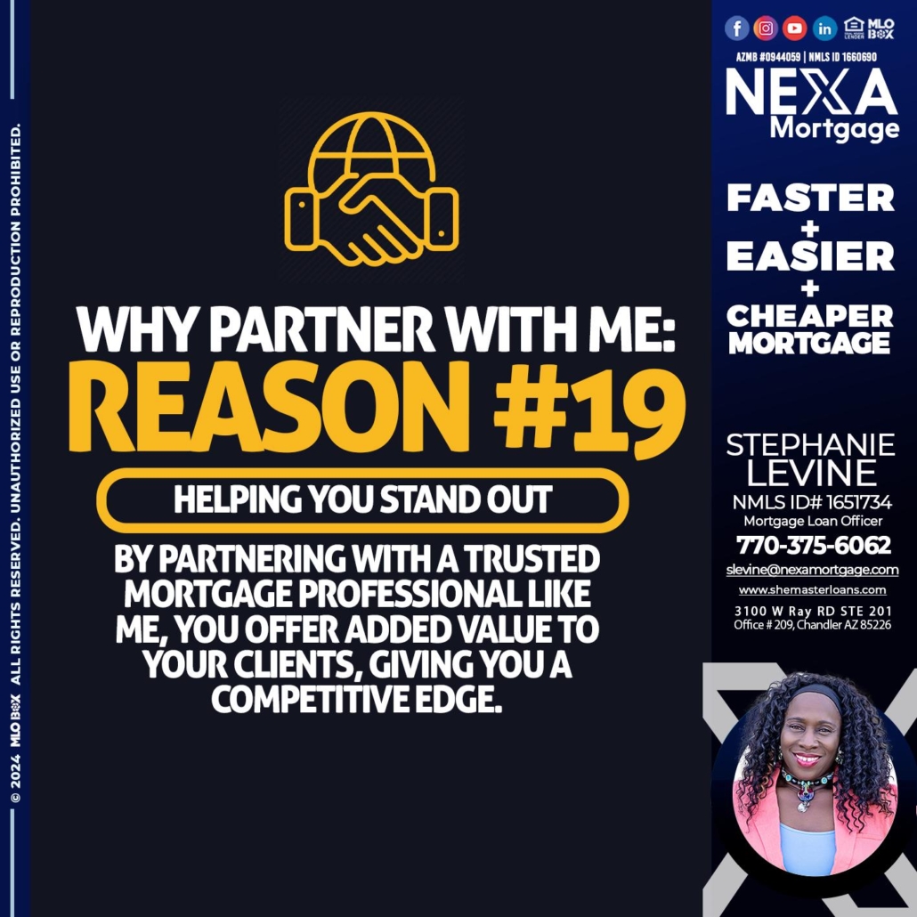 r19 - Stephanie Levine -Mortgage Loan OfficerHi, my name is Stephanie Levine. I’m a Loan Officer with NEXA Mortgage LLC., offering personalized mortgage solutions, fast customized quotes, great rates and service with integrity.