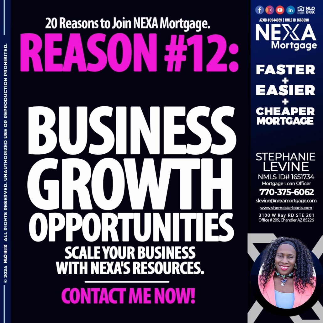 REASON 12 - Stephanie Levine -Mortgage Loan OfficerHi, my name is Stephanie Levine. I’m a Loan Officer with NEXA Mortgage LLC., offering personalized mortgage solutions, fast customized quotes, great rates and service with integrity.