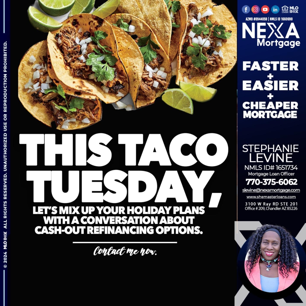 taco tuesday - Stephanie Levine -Mortgage Loan OfficerHi, my name is Stephanie Levine. I’m a Loan Officer with NEXA Mortgage LLC., offering personalized mortgage solutions, fast customized quotes, great rates and service with integrity.