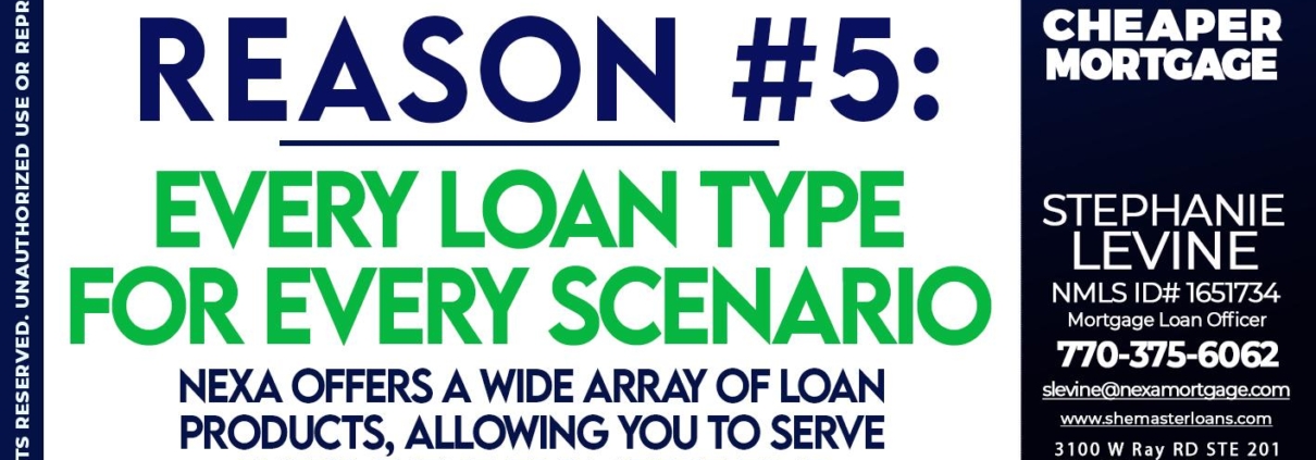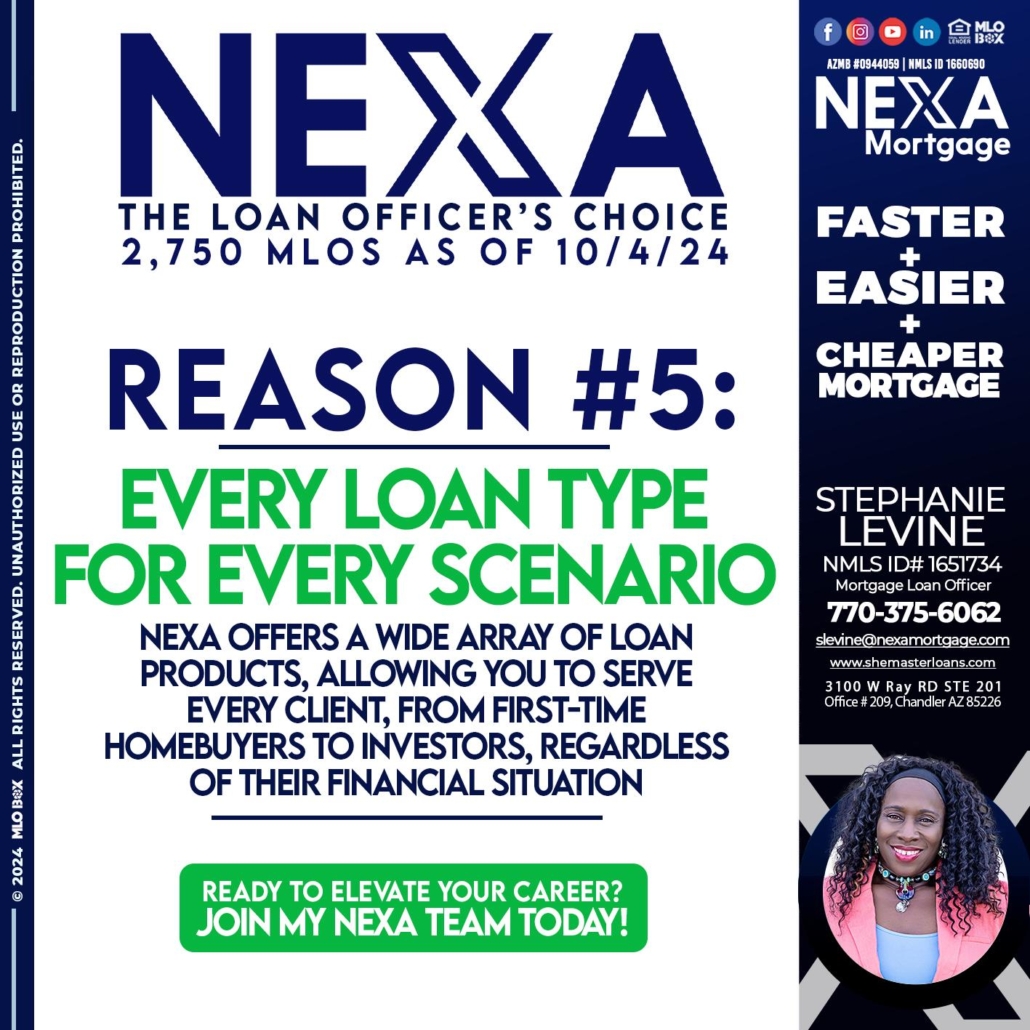 THE LOAN OFFICER´S CHOICE REASON 5 - Stephanie Levine -Mortgage Loan OfficerHi, my name is Stephanie Levine. I’m a Loan Officer with NEXA Mortgage LLC., offering personalized mortgage solutions, fast customized quotes, great rates and service with integrity.