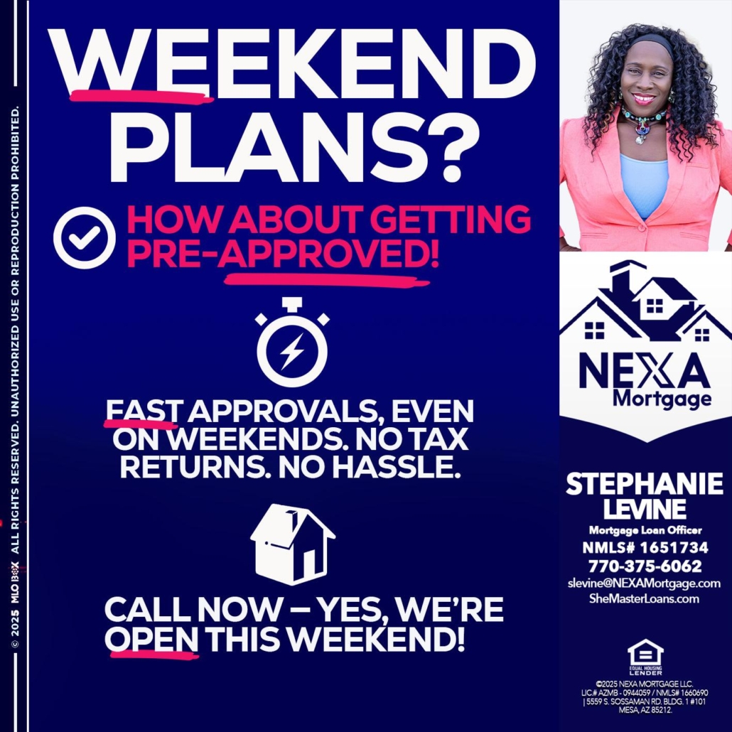 Hi, my name is Stephanie Levine. I’m a Loan Officer with NEXA Mortgage LLC., offering personalized mortgage solutions, fast customized quotes, great rates and service with integrity.
