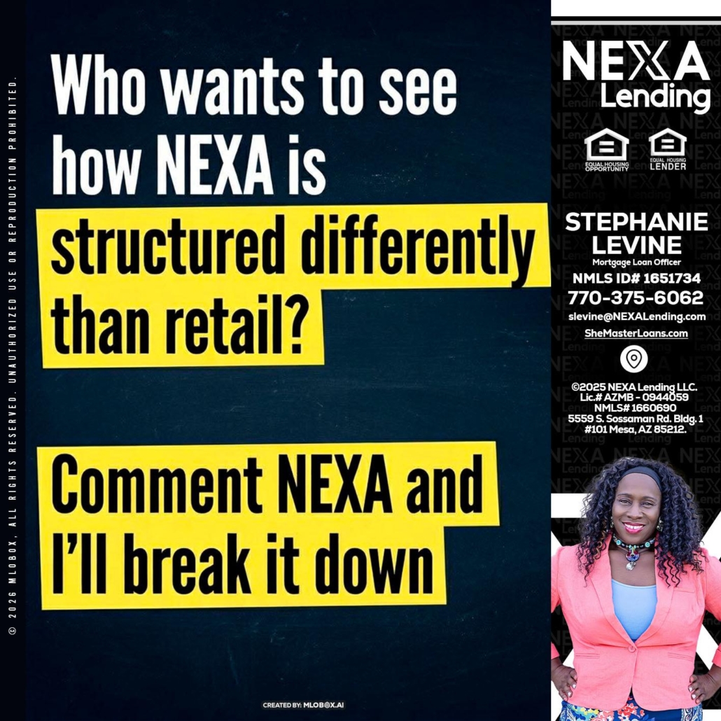 who want to see - Stephanie Levine -Mortgage Loan OfficerHi, my name is Stephanie Levine. I’m a Loan Officer with NEXA Lending LLC., offering personalized mortgage solutions, fast customized quotes, great rates and service with integrity.